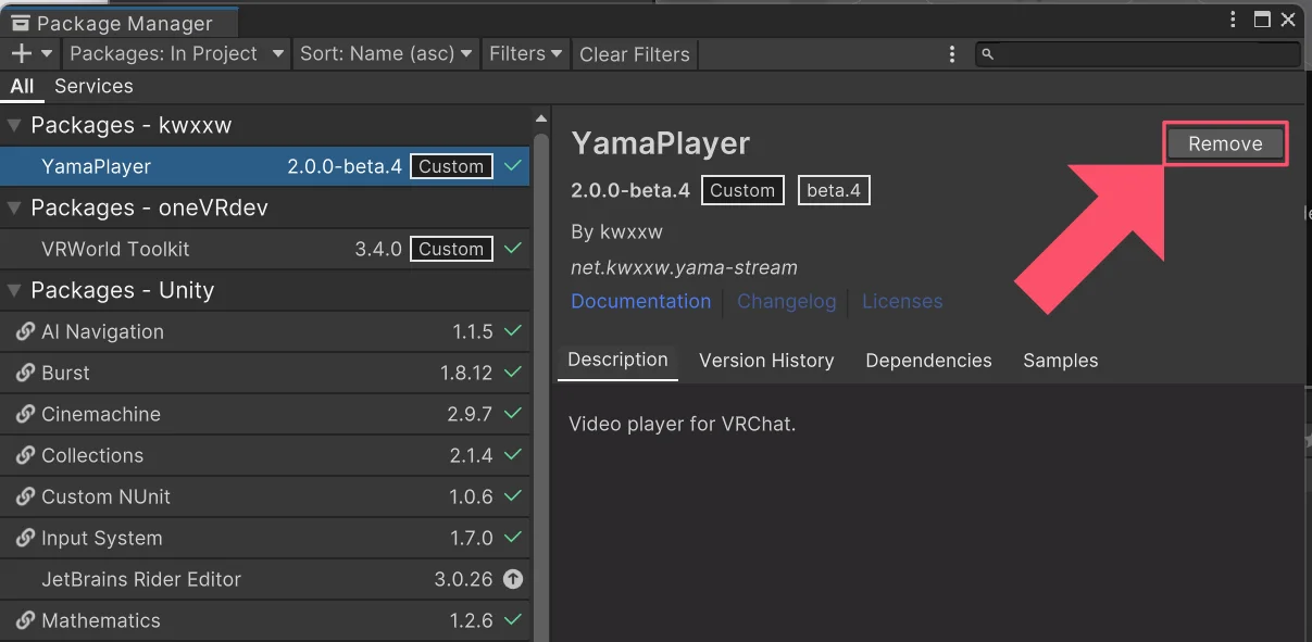 - Unity メニュー Window > Package Manager で YamaPlayer を選択し Remove をクリック