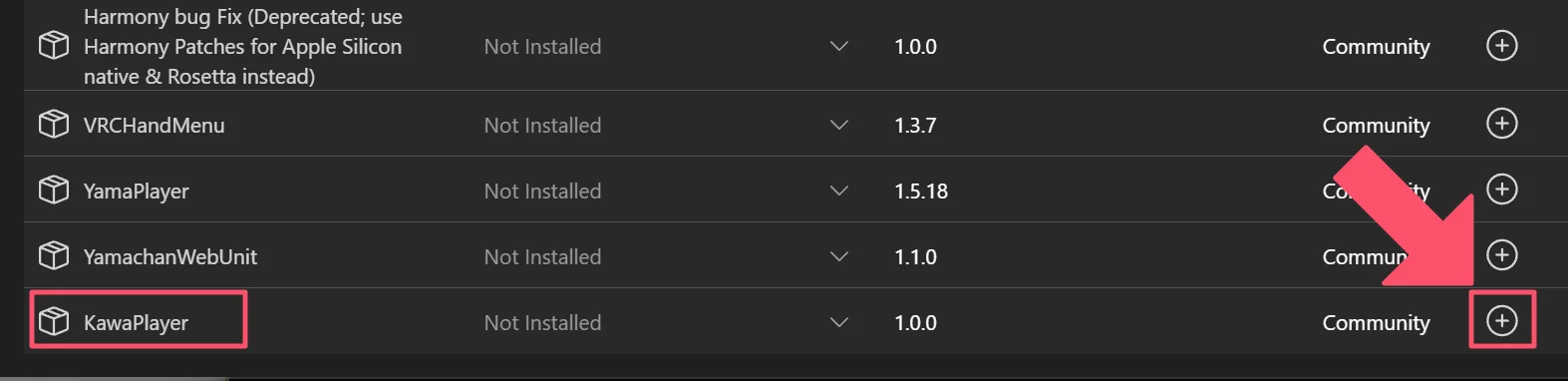 追加後、VCC の Manage Project でプロジェクトを開き、KawaPlayer の + ボタンをクリックしてインストールします。