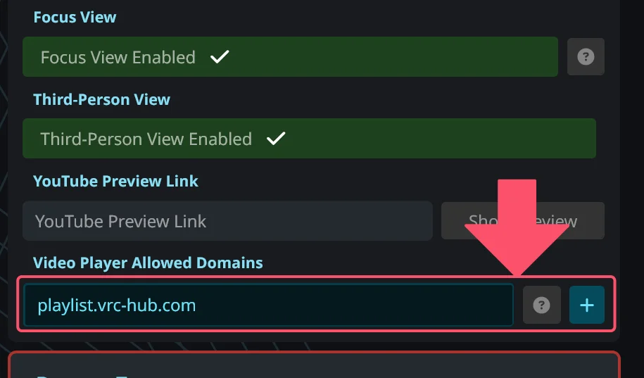 - 対象のワールドを選択し、「Video Player Allowed Domains」 セクションに以下のドメインを追加