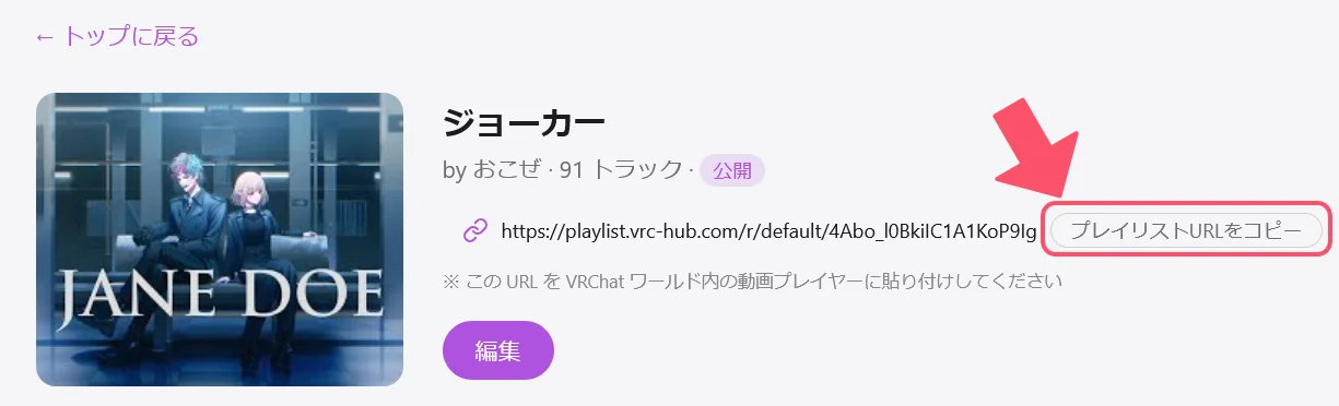 プレイリストページを開いたら、VRChat URL の欄にある「コピー」ボタンをクリックしてください。これだけで準備完了です!